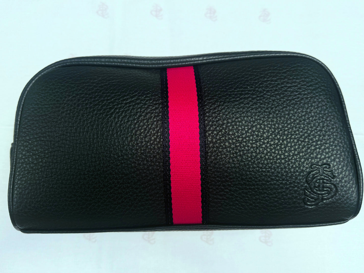 Leather washbags for your toiletries, available in navy & tan with the SJC logo embossed.